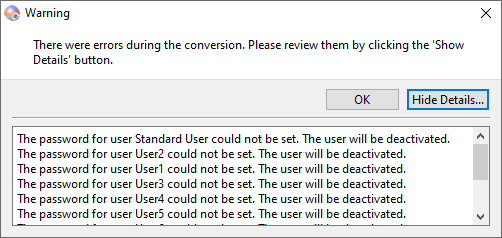 Is the table scheme of the source DB correct? | In case of a lack of integrity in source DB (missing columns) the conversion is aborted. Please note that the source DB must be in the starte for version 4.5.x to have all tables correct. | |