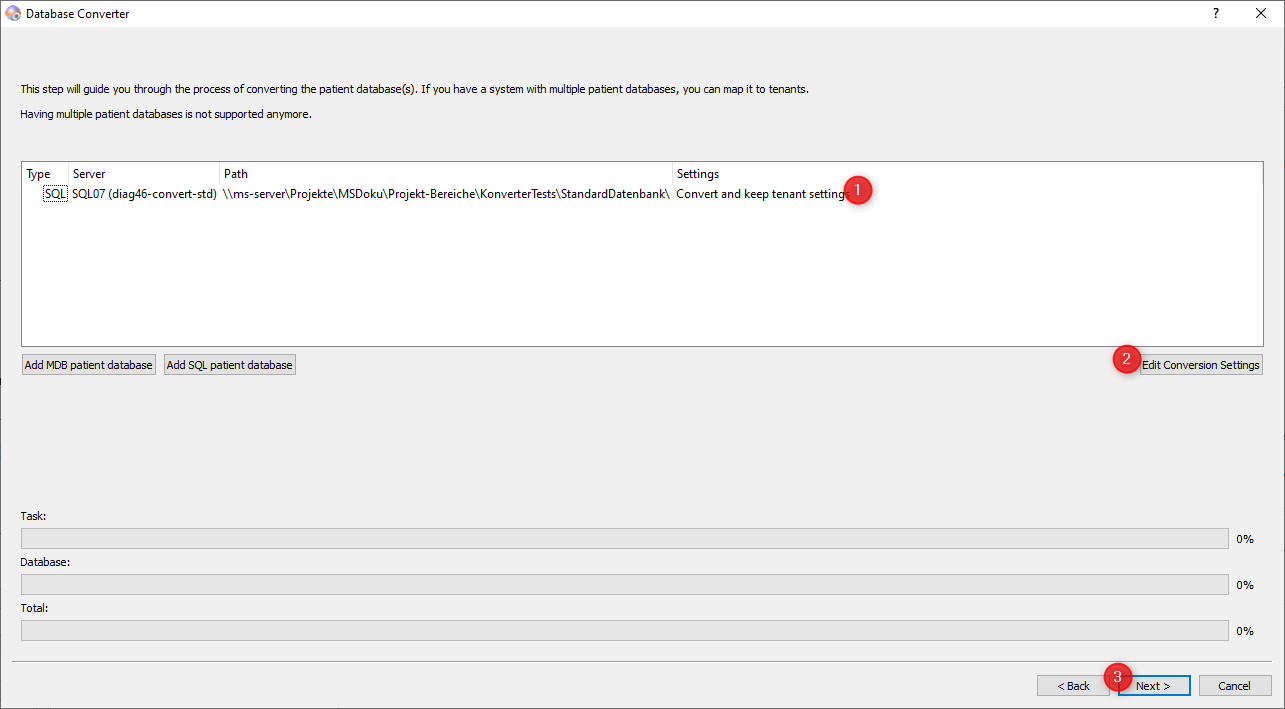 - Auf Start Database Conversion drücken. Danach öffnet sich die Seite für die Konvertierung der Konfigurationsdatenbank