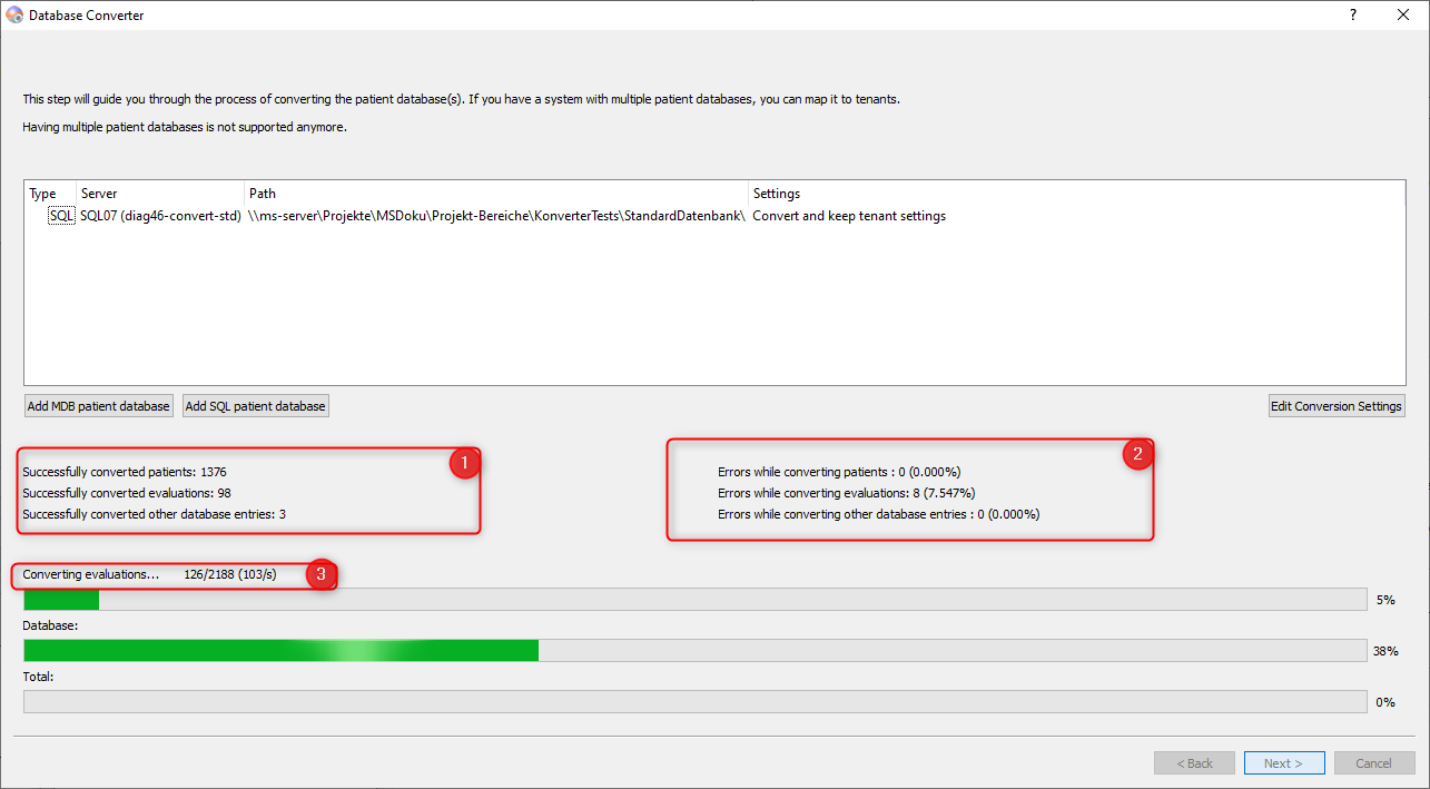 - Hier sieht man die Anzahl der bereits konvertierten Datenbankeinträge