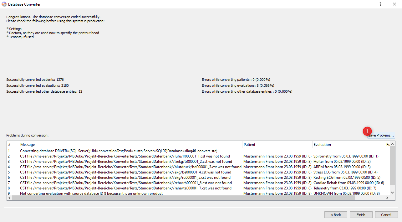 Treten Fehler während der Konvertierung der Einstellungen auf, erscheint ein Dialog mit dem Hinweis auf die Probleme. Diese können später auch noch als Excel-Datei gespeichert werden und stehen in den service center logs unter %PUBLIC%/Roaming/customed/...servicecenter.log